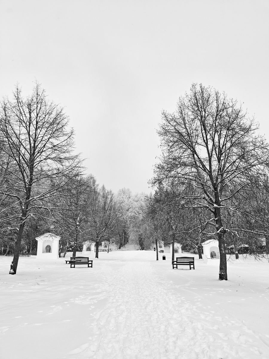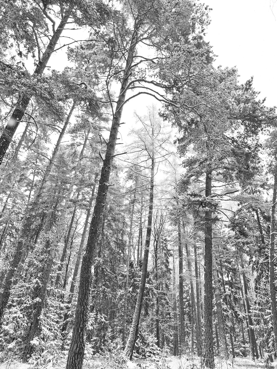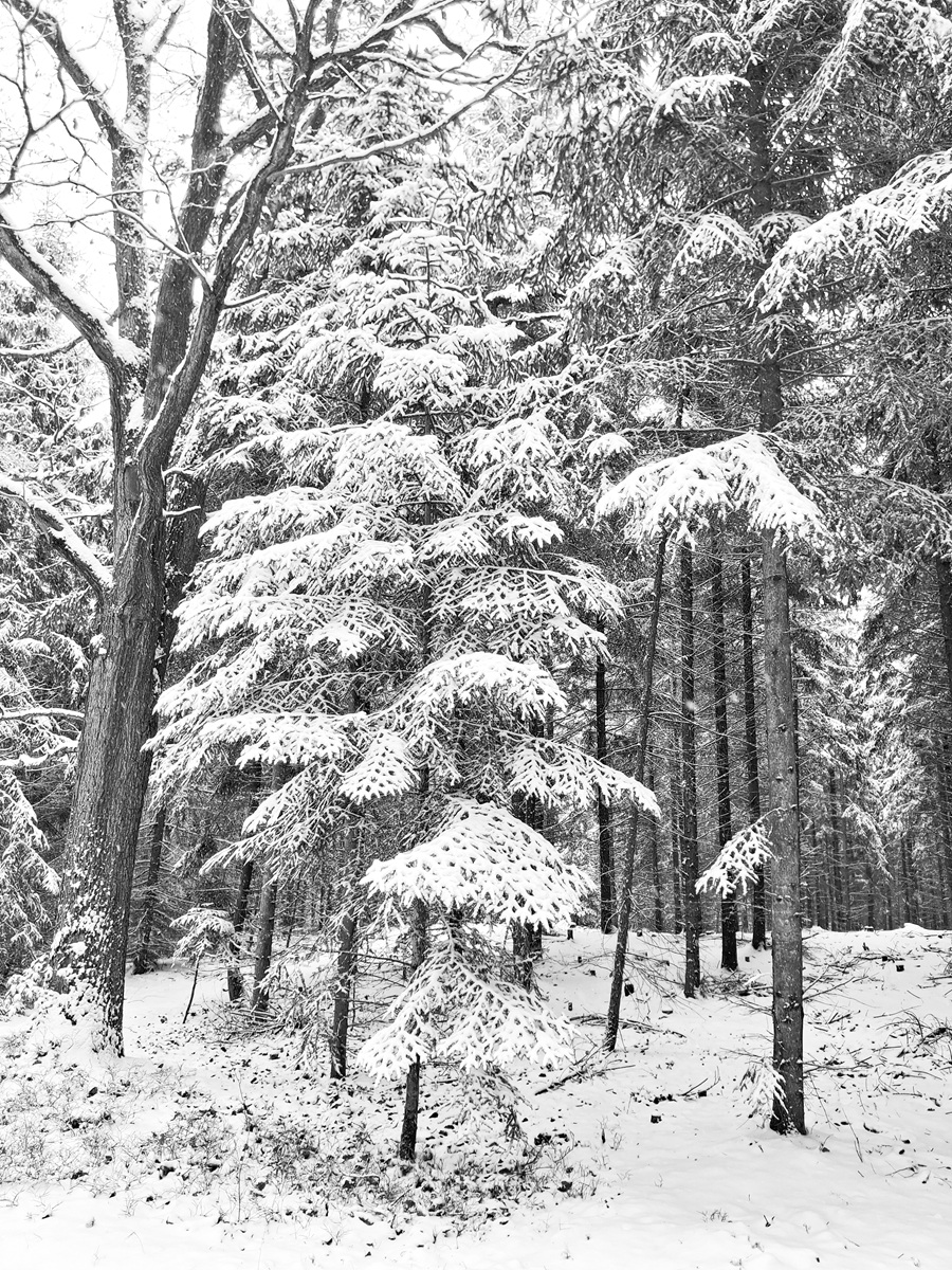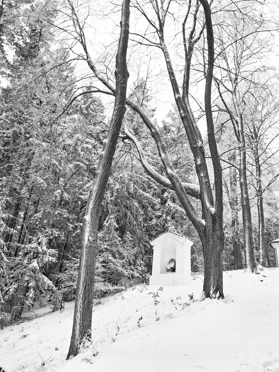 Cesta zimním lesem. Sněhu je tolik, „jako když jsme byli malí“. Čistá krása. Pár fotek z mobilu mi připomíná staré kresby tuší.