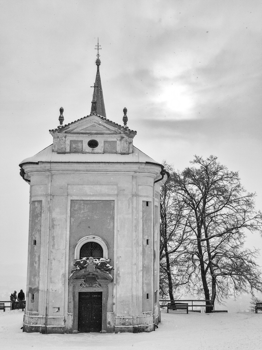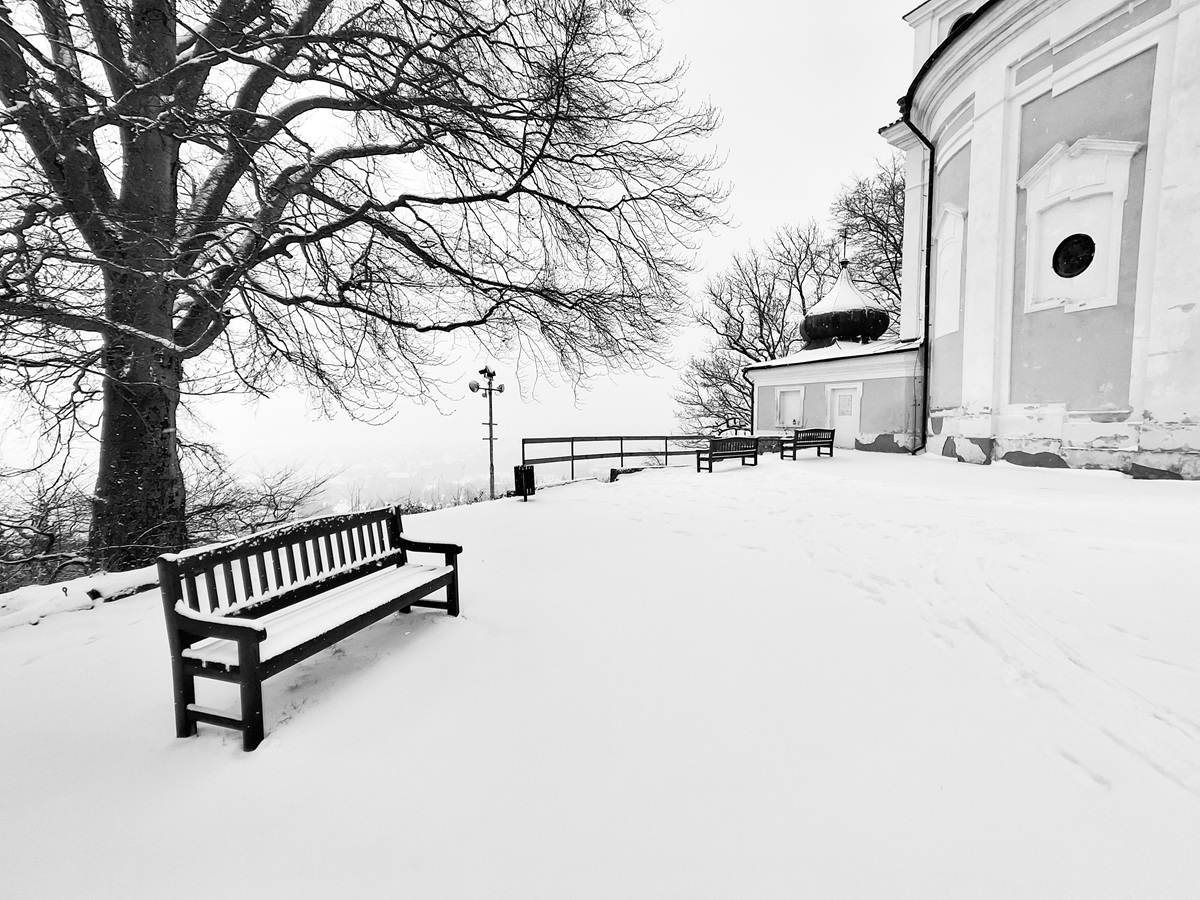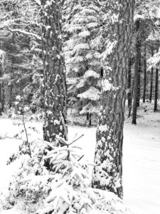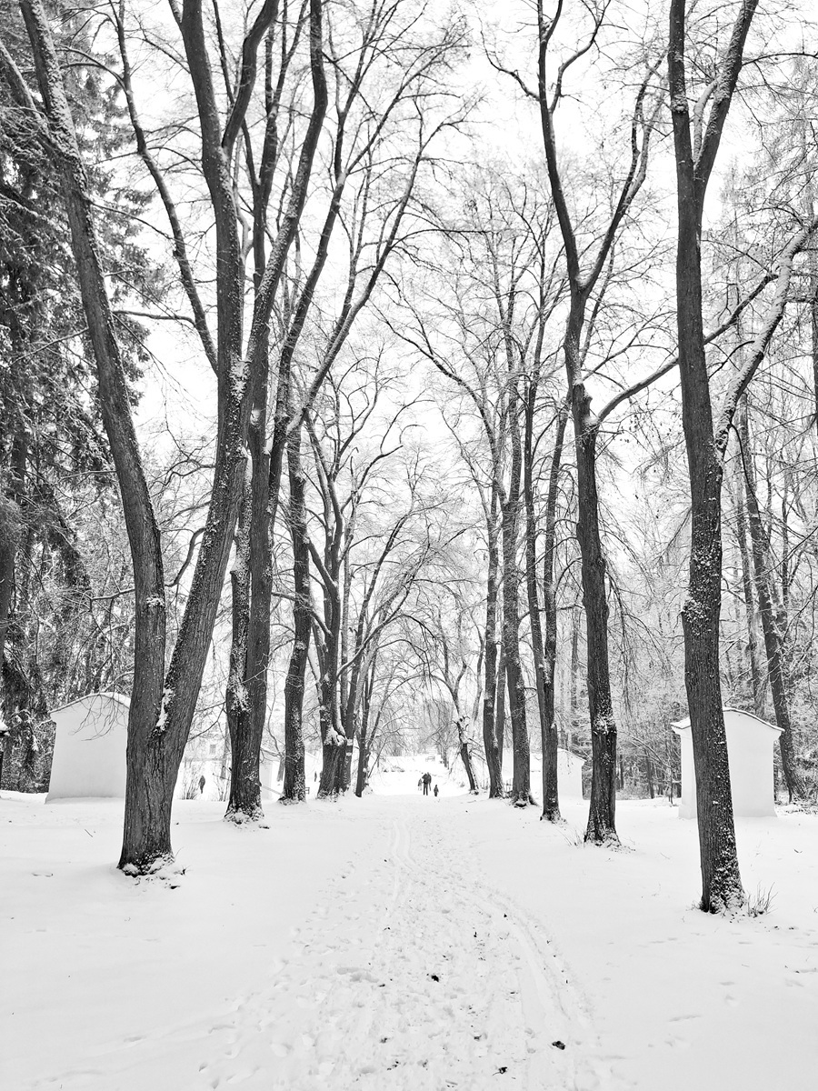 Cesta zimním lesem. Sněhu je tolik, „jako když jsme byli malí“. Čistá krása. Pár fotek z mobilu mi připomíná staré kresby tuší.